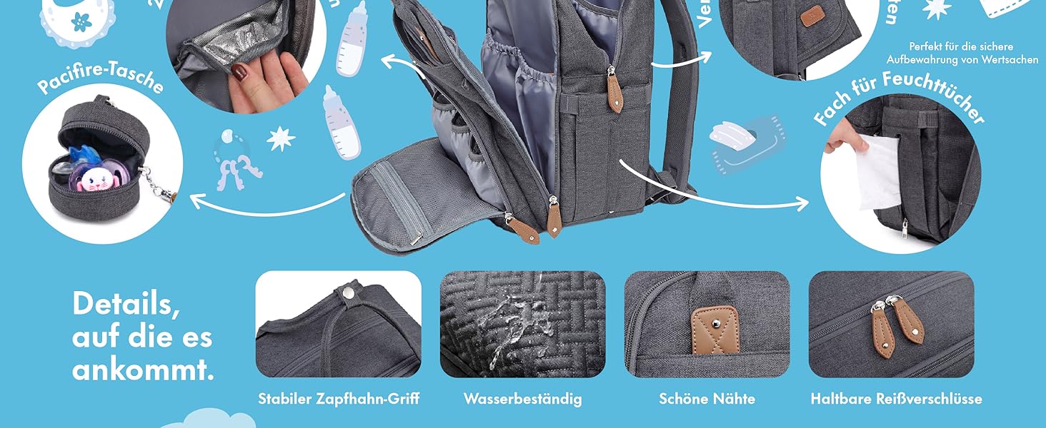 Der Rucksack sieht schön aus und ist gut verarbeitet. Er hat sehr viele Fächer und Reißverschlüsse. Es hat so viel Stauraum, dass ich ab und zu etwas im Rucksack verliere. Die Wickeltasche ist sehr praktisch und hat sogar eine integrierte Wickelunterlage.