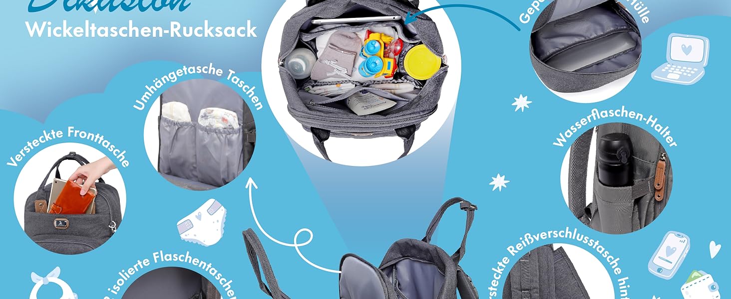 Sehr viel Stauraum und Fächer. Benutze den Rucksack für 2 Wickelkinder. Wir haben dort immer ein Paar Wechselklamotten für Kleinkind und Baby, sowie jeweils 2 Unterlagen, 2 Größen Windeln, Mullwindeln, Trinkflaschen und Snacks drin. Passt alles problemlos rein und alles ist gut sortiert. Bin wirklich begeistert. Obwohl die Qualität auf den ersten Blick eher billig wirkt, kann ich bisher (6 Monate in Gebrauch) keine Mängel feststellen.