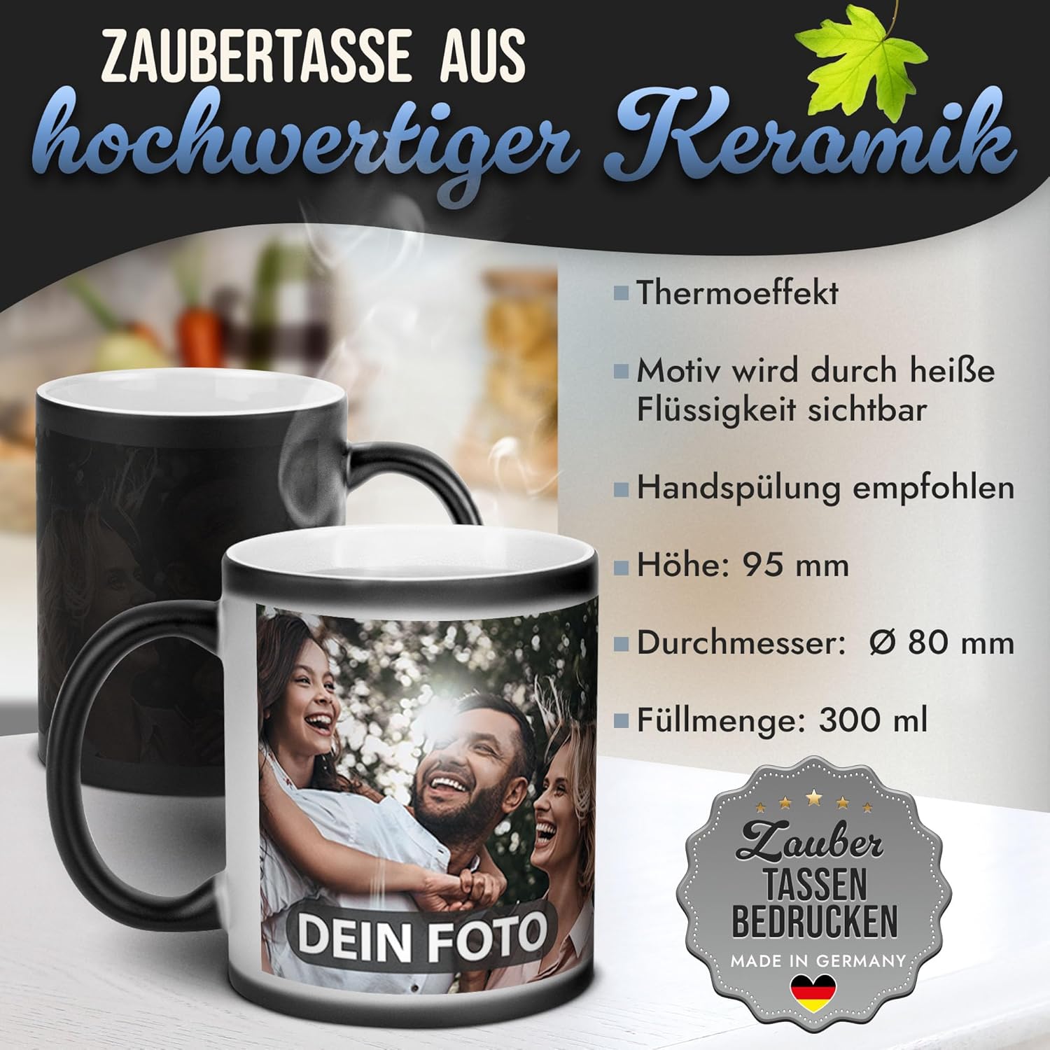 Wunderschöne Zaubertasse mit eigenem Foto selbst gestalten. Ideales Geschenk mit Zauber-Effekt zum Geburtstag, Weihnachten oder als Hilfe für den Heiratsantrag – besonders und persönlich. Der neue Lieblingskaffeebecher, für die Kaffeepause zuhause oder im Büro.