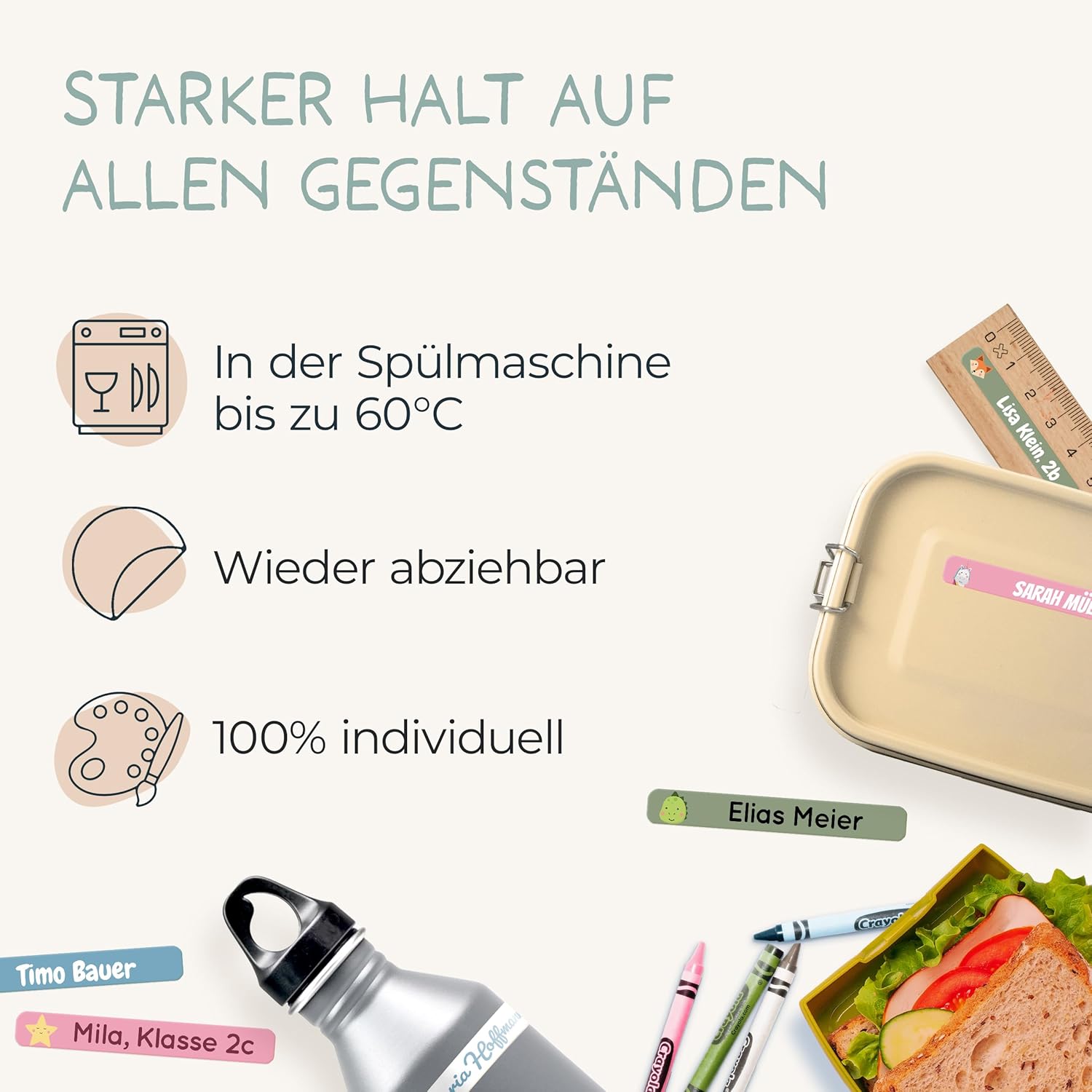 ✔️ WASSERFEST: Die Namensaufkleber für Kinder haben eine sehr hohe Haftbarkeit und sind bis zu 60 °C. spülmaschinenfest. Unzählige Waschtests haben die Sticker bestanden.